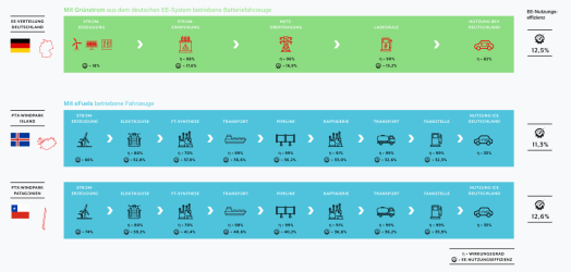 Fichtners Zahlenangaben sind in etwa zutreffend, und seine Argumentation wirkt auf den ersten Blick überzeugend. Der Leser gewinnt den Eindruck, es ginge um einen Vergleich zweier möglicher Verwendungen für den hierzulande erzeugten Grünstrom. Mit 70 bis 80 % Wirkungsgrad scheint das Elektroauto dabei unschlagbar gut abzuschneiden. Die Verwendung als E-Fuel bedeutet demgegenüber eine lange Kette von Umwandlungen: Der Strom wird unter großen Verlusten zunächst in Wasserstoff und dann in E-Fuel umgewandelt. Damit wird schließlich ein Verbrennungsmotor betrieben, der je nach Betriebszustand weit über 60 % des Kraftstoffs als Wärme vergeudet. Fichtner will den Leser glauben machen, E-Fuels wären Energieverschwendung.