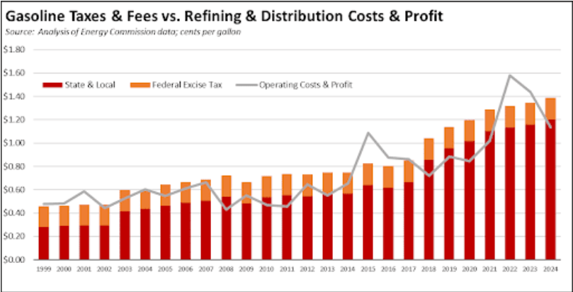 „Kraftstoffsteuern und -gebühren … verdoppeln … die Kosten für die Raffinierung und Lieferung von Benzin in diesem Staat. Kein anderes Produkt, vor allem keines, das so entscheidend für die Lebenshaltungskosten der Kalifornier ist, wird mit einer solchen Steuer belegt.“