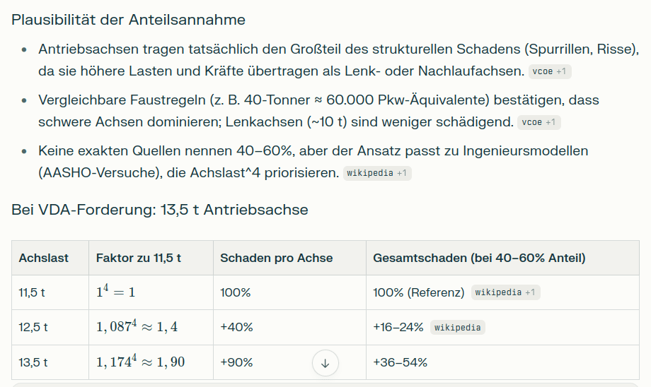 Der VDA fordert zwei Tonnen mehr zulässige Achslast auch für Sattelzugmaschinen mit nur zwei angetriebenen Rädern, also einer Antriebsachse. Diese würde sogar 90 % mehr Straßenschäden anrichten ((13,5/11,5)4 ≈ 1,9)!