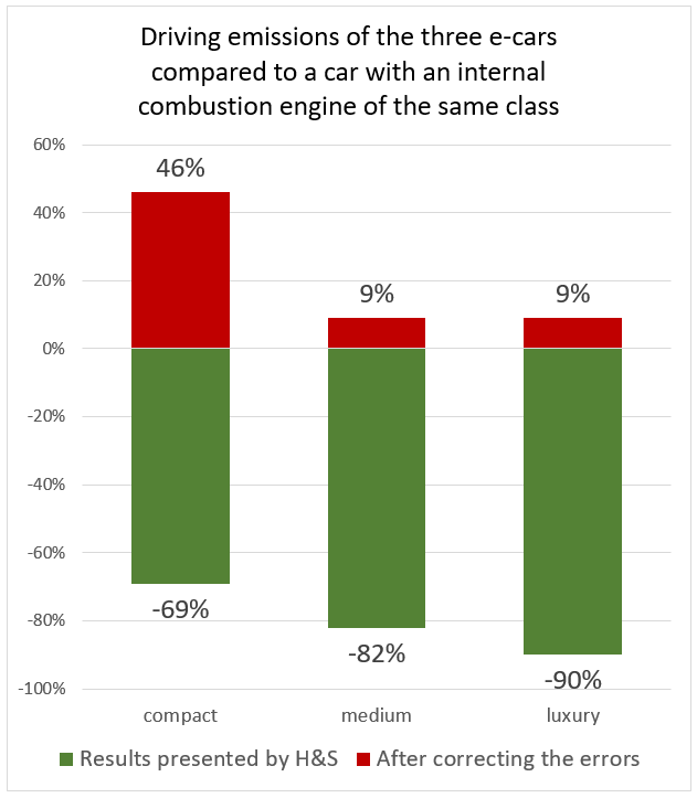 | Vehicle category | H&S claim that the electric car has lower emissions by | After correction of the errors it has increased emissions by |