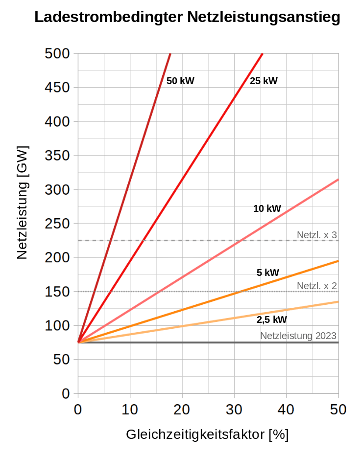 Der Anteil der gleichzeitig Ladenden entspricht dem so genannten Gleichzeitigkeitsfaktor. Aktuelle Empfehlungen zur Auslegung von Niederspannungsnetzen sehen Werte weit oberhalb von 10 % vor. In einem Feldversuch von 2022 in Deutschland wurde für E-Autos ein mittlerer Wert von 50 % gemessen (mit einer Schwankungsbreite von 22 bis 88 %). Doch selbst wenn nur etwas mehr als 6 % von 48 Millionen Autos gleichzeitig mit 25 kW geladen würden, müsste die Netzleistung relativ zu 2023 bereits verdoppelt werden.